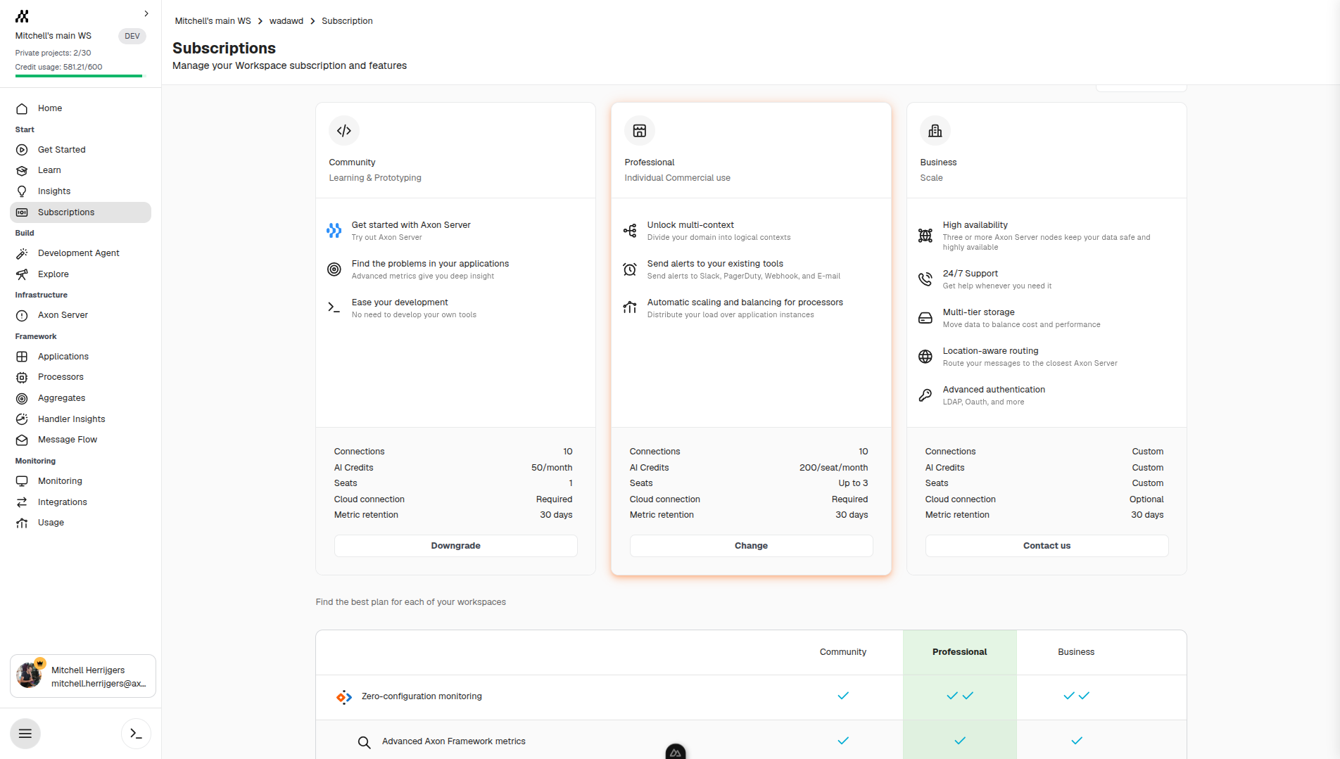 While the basic functionalities of Axoniq Platform are free through the Community plan, our most powerful features require a subscription. You can see the features of each plan within Axoniq Platform itself, as shown below.